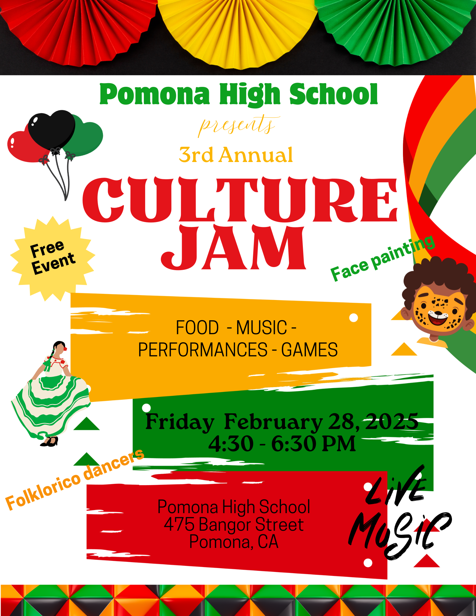 Calling all Pomona High families, friends and community members! Pomona High School will be kicking off Hispanic Heritage Month with a celebration next Thursday, September 14th from 4:30 - 6:30 pm outside of the cafeteria. The first annual Noche de Cultura will include music, food, performances, and fun! See you there.